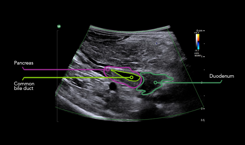iUS uses color flow doppler to help differentiate between vessels and ducts and is overall effective at imaging difficult cases such as inflammation or fibrosis .1.4 - 6