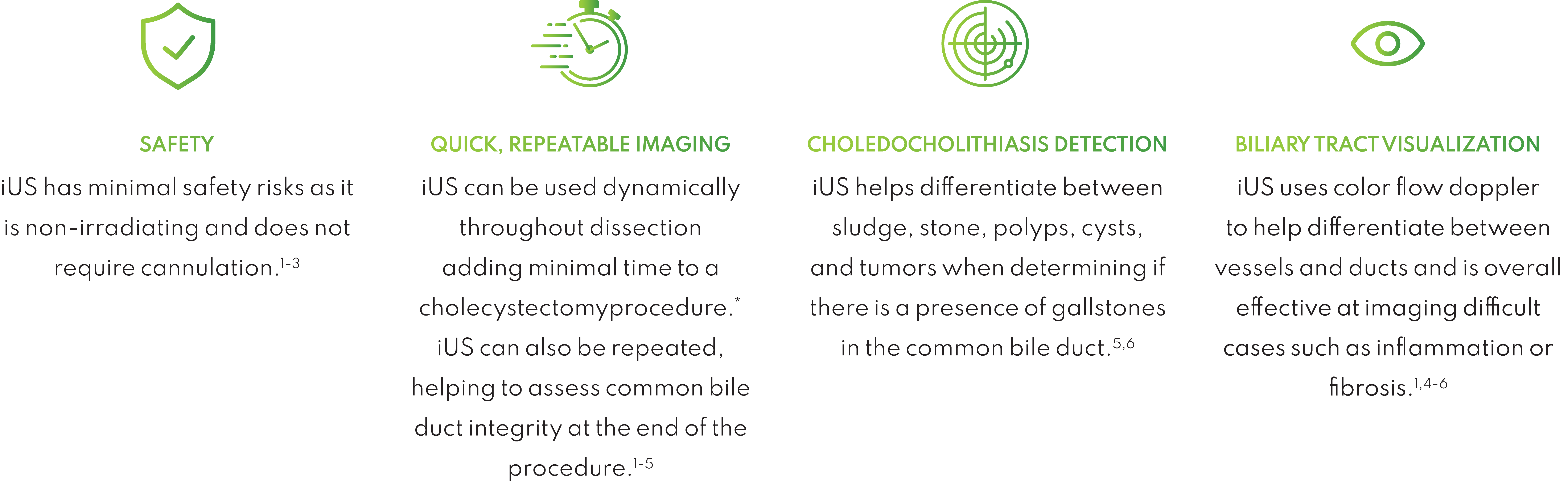 iUS can be used dynamically throughout dissection adding minimal time to a cholecystectomy procedure. iUS can also repeated, helping to assess common bile duct integrity at the end of the procedure.1-5